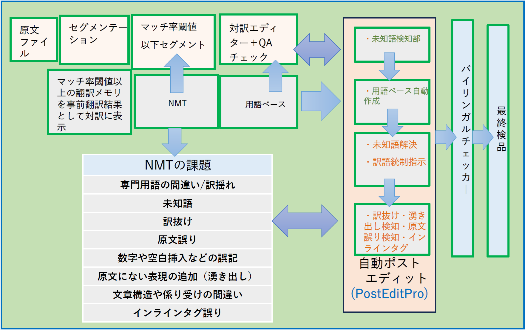 大規模言語モデル(LLM)を使用してこのプロセスを実行するPostEditPro™が注目されています。翻訳支援ツールは、これまでマッチ率が高いセグメントについては翻訳メモリを、それ以下のセグメントについては、NMTによるMT訳を挿入し、翻訳者がポストエディットを行っていました。