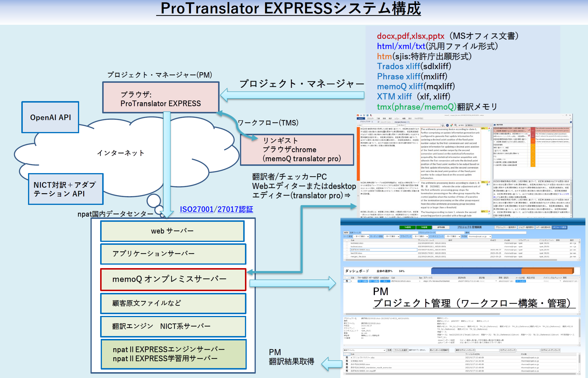 ProTranslator EXPRESSは、memoQオンプレミスサーバーをコアとし、各種MTと生成AIを統合した統合翻訳支援ツールです。日本特許翻訳株式会社(npat)が開発した高度な翻訳テクノロジーにより、翻訳の効率性・一貫性・精度を大幅に向上させます。